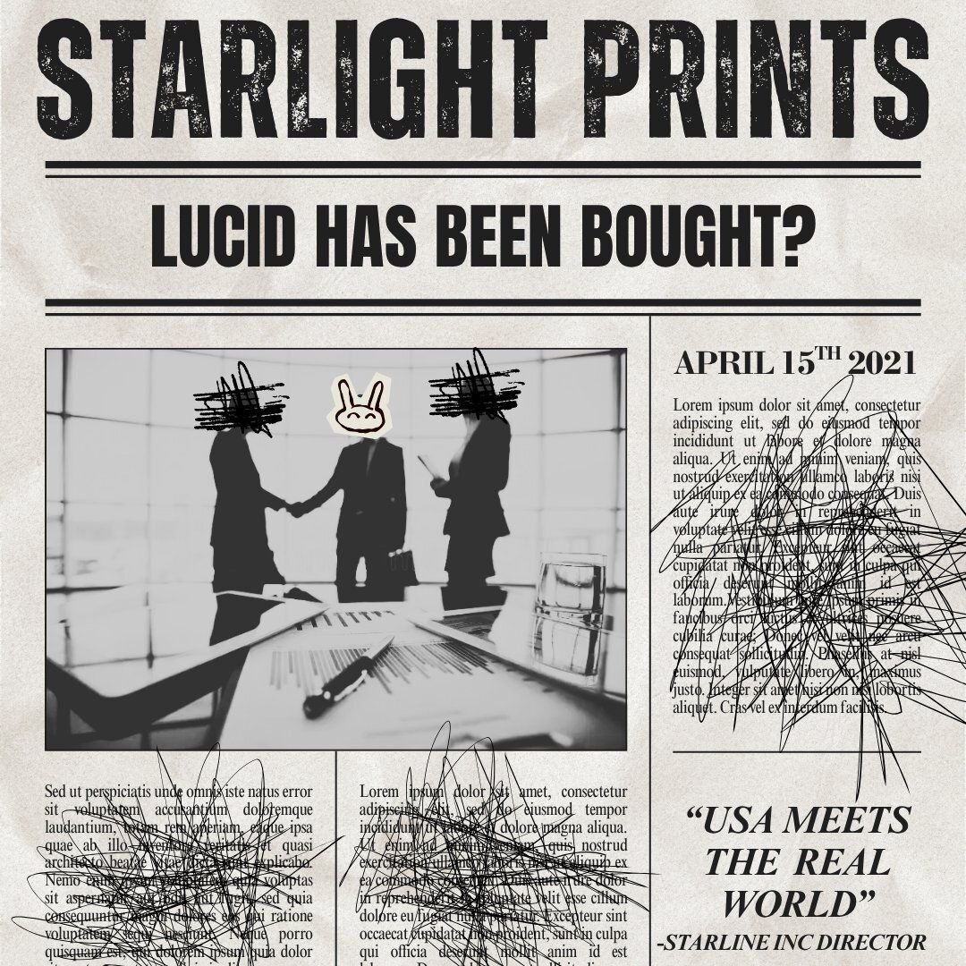 The image above from LOCKED SMPS' second Twitter post appears to be a newspaper article of some sort. For some bizarre reason, most of the newspaper is scratched including two figures who appear to be shaking hands with a bunny figure who just so happens to not be scratched out. However, the strange bunny figure isnt the only thing that is clearly visible. The heading of the News article is also visible and of which says, “LUCID HAS BEEN BOUGHT?” Above it you can see the company publisher.. Name… person thing which goes by the name of “STARLIGHT PRINTS”. I almost forgot, but there is a subheading that can also be read clearly which is titled, “USA MEETS THE REAL WORLD” which is apparently a quote by a Starline inc director??
